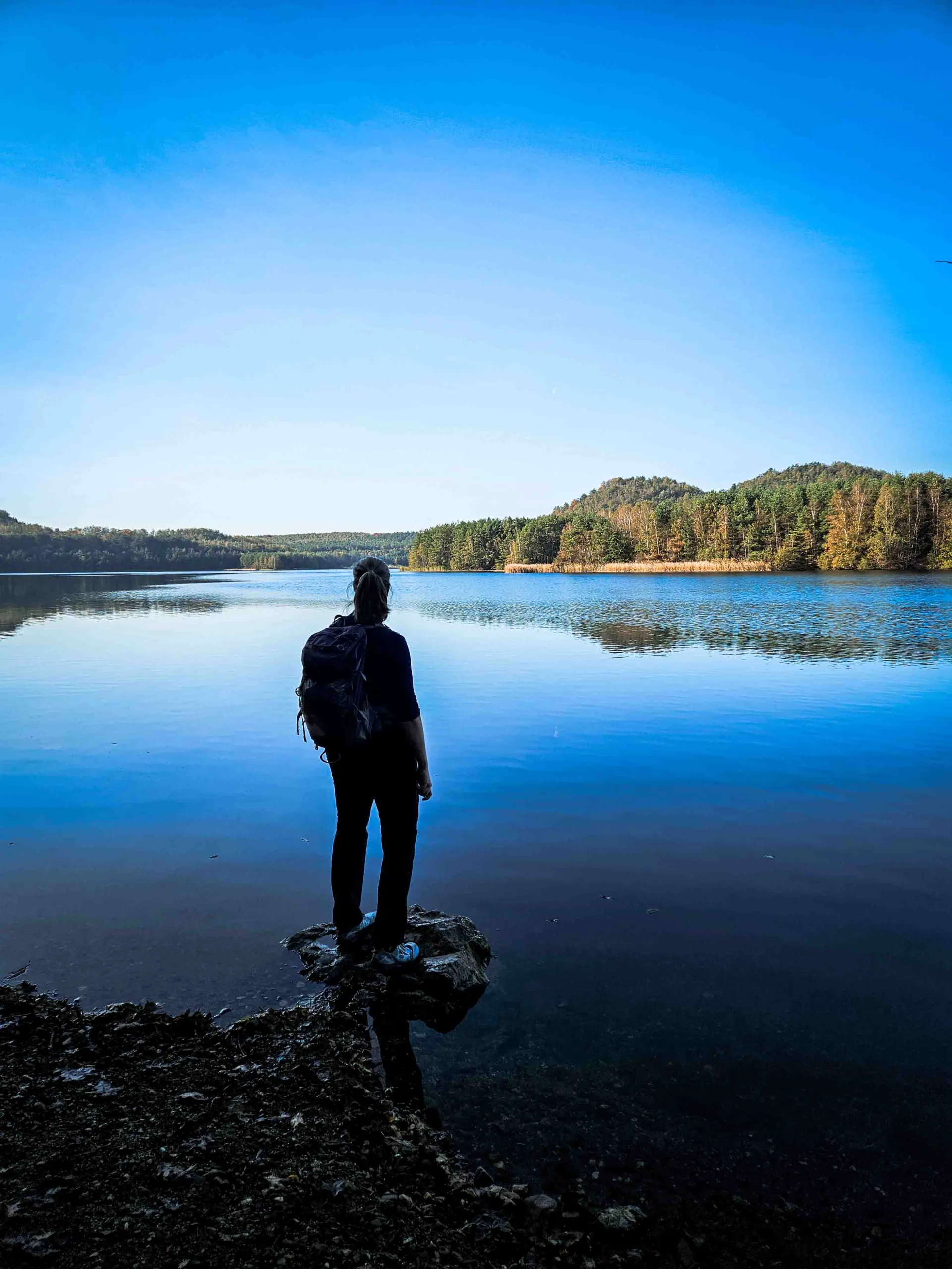 Het laatste deel van de route biedt een welkome afwisseling op de eerdere uitdagende paadjes. Het pad langs het meer is breed en afgezien van wat modderplassen goed begaanbaar. Ideaal om het tempo er lekker in te houden. De Rode Terril blijft rechts liggen, terwijl de route kilometers langs de oever van de Grote Plas loopt. Het uitzicht over het blauwe water en de daarin weerspiegelende terrils is een laatste pauzemomentje waard.