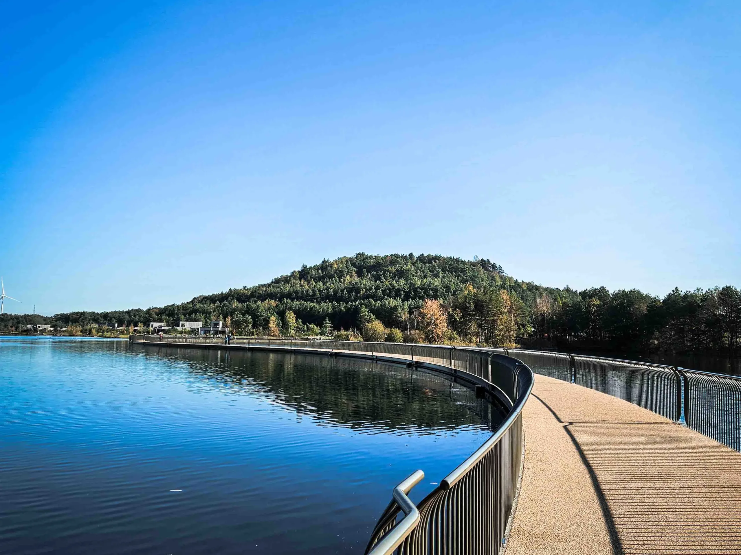 Ik verlaat de Lange Terril via goed begaanbare paden en daal af naar de nieuwste highlight van Terhills. De fiets- en wandelbrug is geopend in oktober 2024. Hier is het gezellig druk; wandelaars en fietsers staan stil om te genieten van het uitzicht over het blauwe water en de terrils die aan weerszijden oprijzen. Ik neem het uitzicht in me op en zoek dan de rust van het onverharde wandelpad weer op.