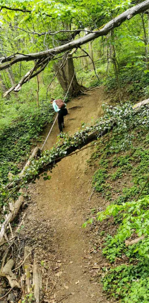 Wat de wandeling bijzonder maakt, is de afwisseling van het terrein. Je loopt door schaduwrijke bospaden, maar ook over open stukken met weidse uitzichten over het omliggende landschap. De route bevat ook een aantal steile hellingen, die voel je gegarandeerd in je kuiten! Wel is het uitzicht zeer de moeite waard. Je herkent de top aan een boom, die volgehangen is met bergschoenen.