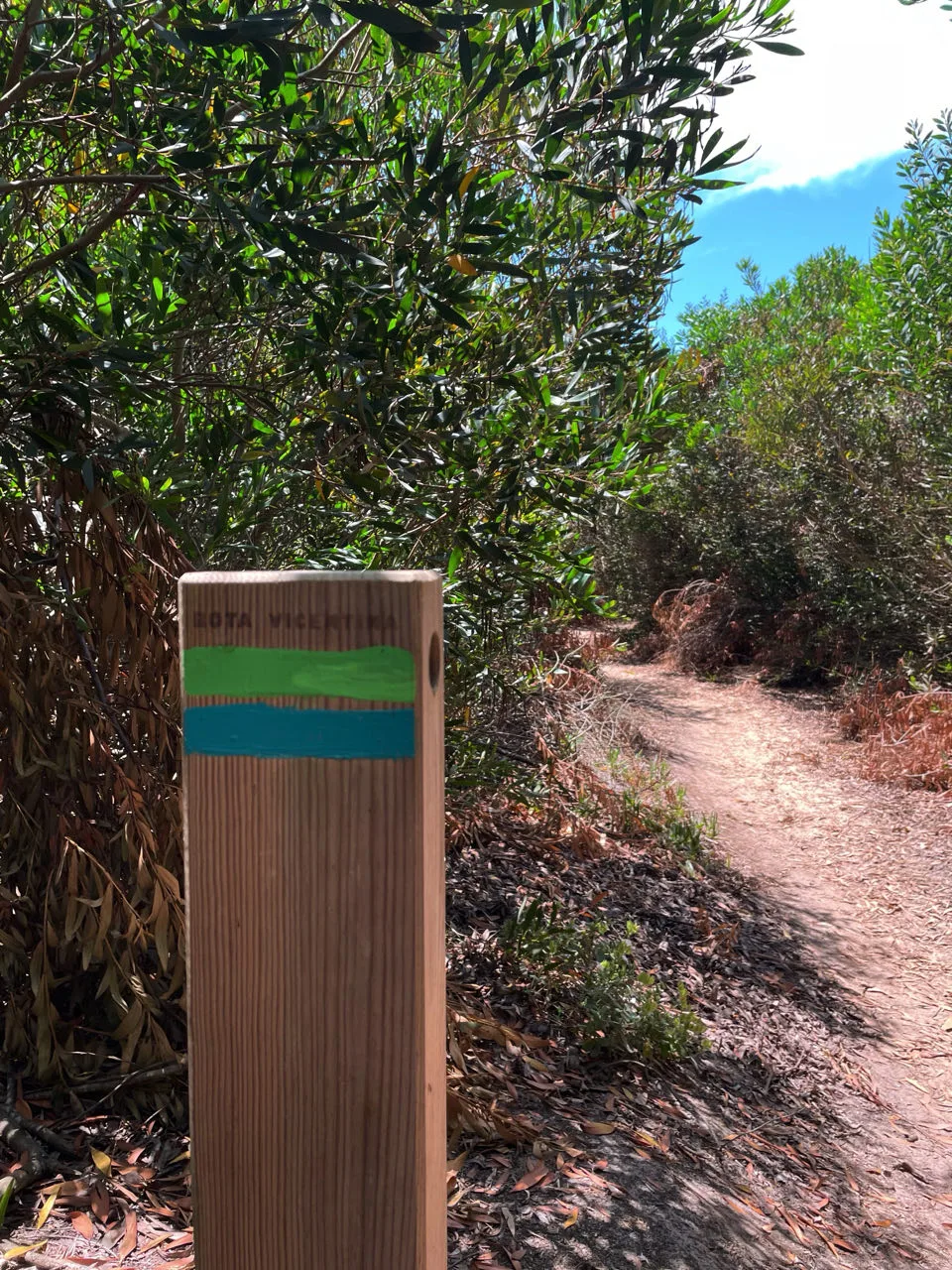 Onderweg wisselden smalle paadjes door het bos en ruige kustlijnen elkaar af. De geur van dennenbos i.c.m. warmte maakt me altijd rustig. Het is magisch om vanuit het bos het water tegen de rotsen te horen kletteren. De blauw groene routebordjes waren niet te missen. Verdwalen wordt de komende dagen lastig.