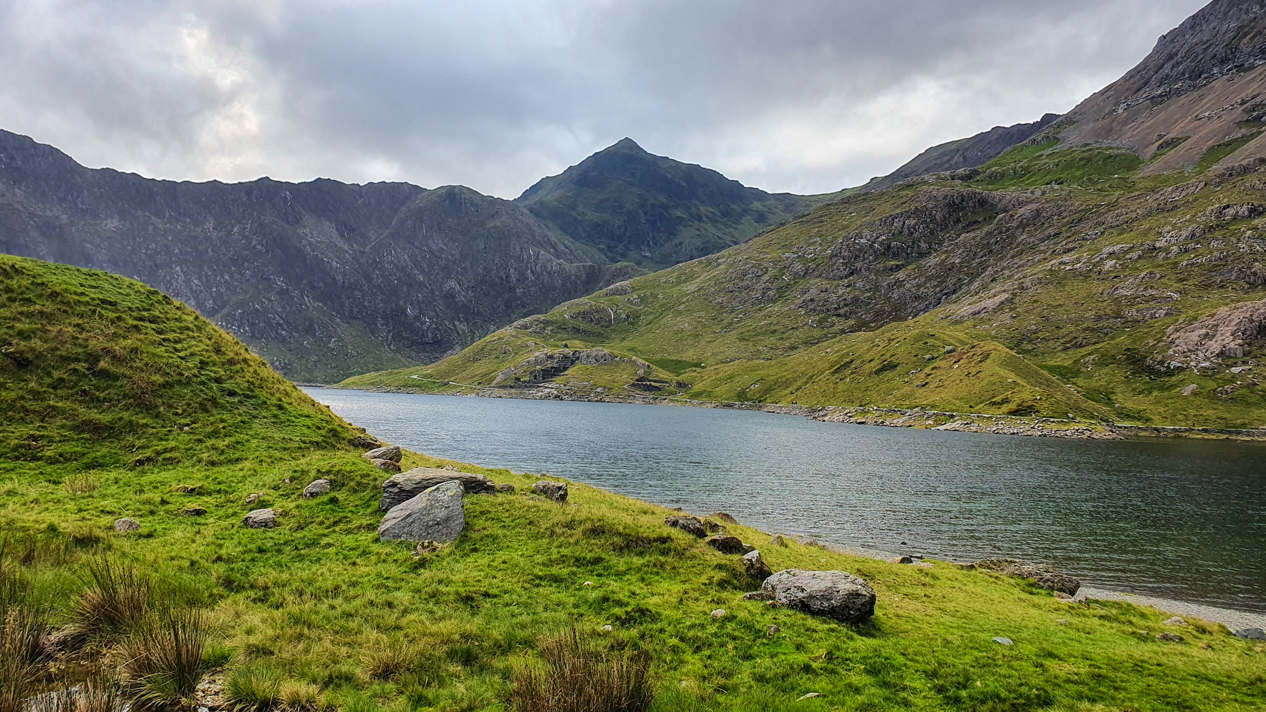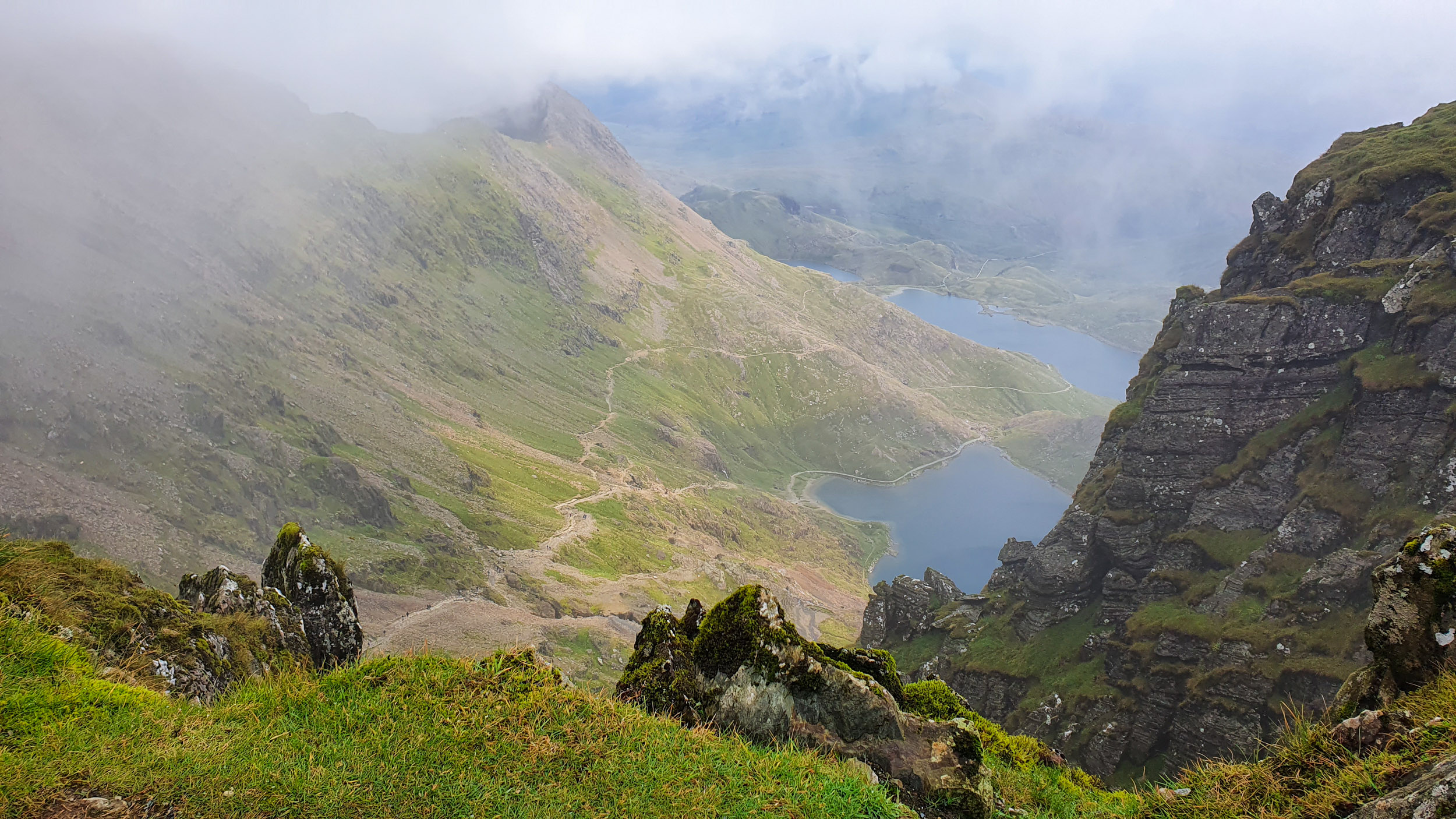 Na de eerste paar kilometers klaart het dermate op, waardoor steeds meer van dit bijzondere landschap wordt onthuld. Terwijl we onze ogen uitkijken, staan we meerdere keren stil om op adem te komen. Het meer Llyn Llydaw ligt glad en groots onder ons. Met elk stukje dat zichtbaar wordt van de omgeving, wordt mijn glimlach breder. Er is iets wat woordeloos tussen ons hangt als we elkaar aankijken. Het is de reden waarom mijn man en ik graag eropuit trekken; de verwondering en energie die we voelen door in de natuur te zijn, in al haar verscheidenheid.