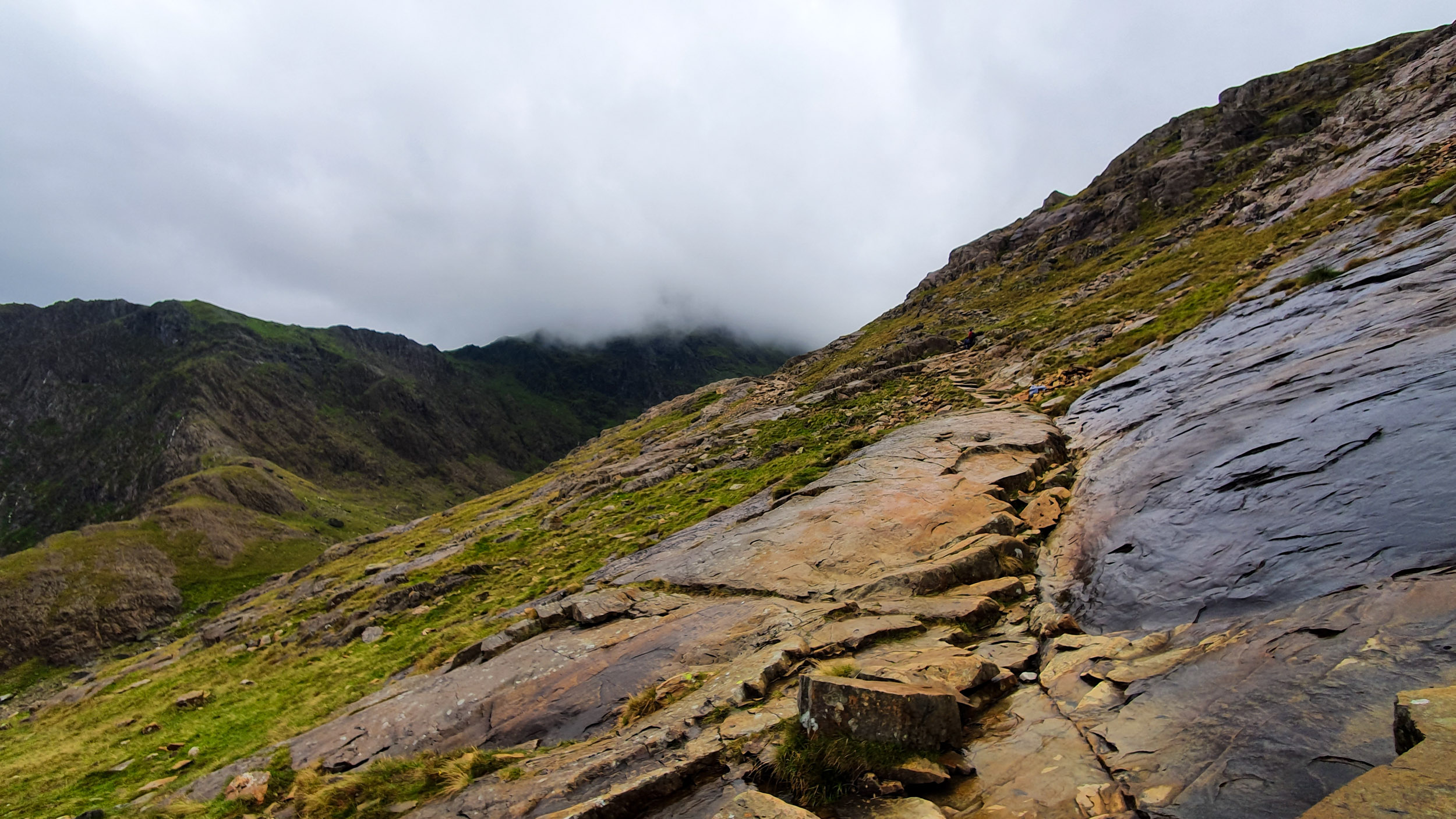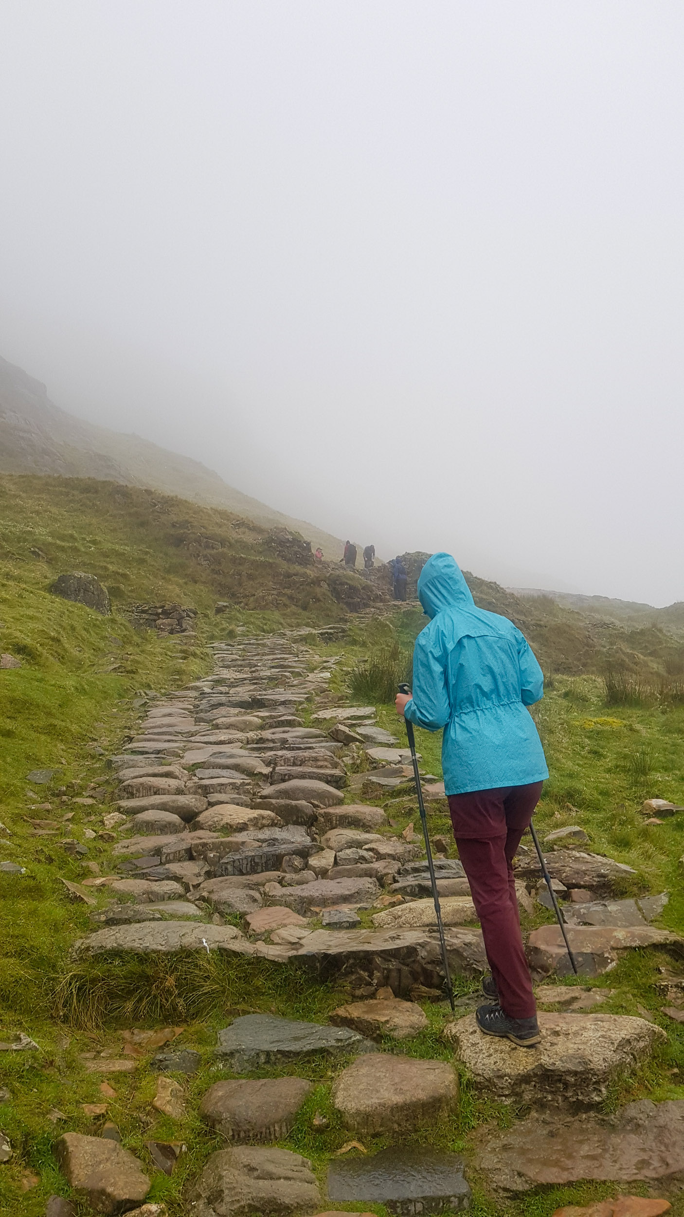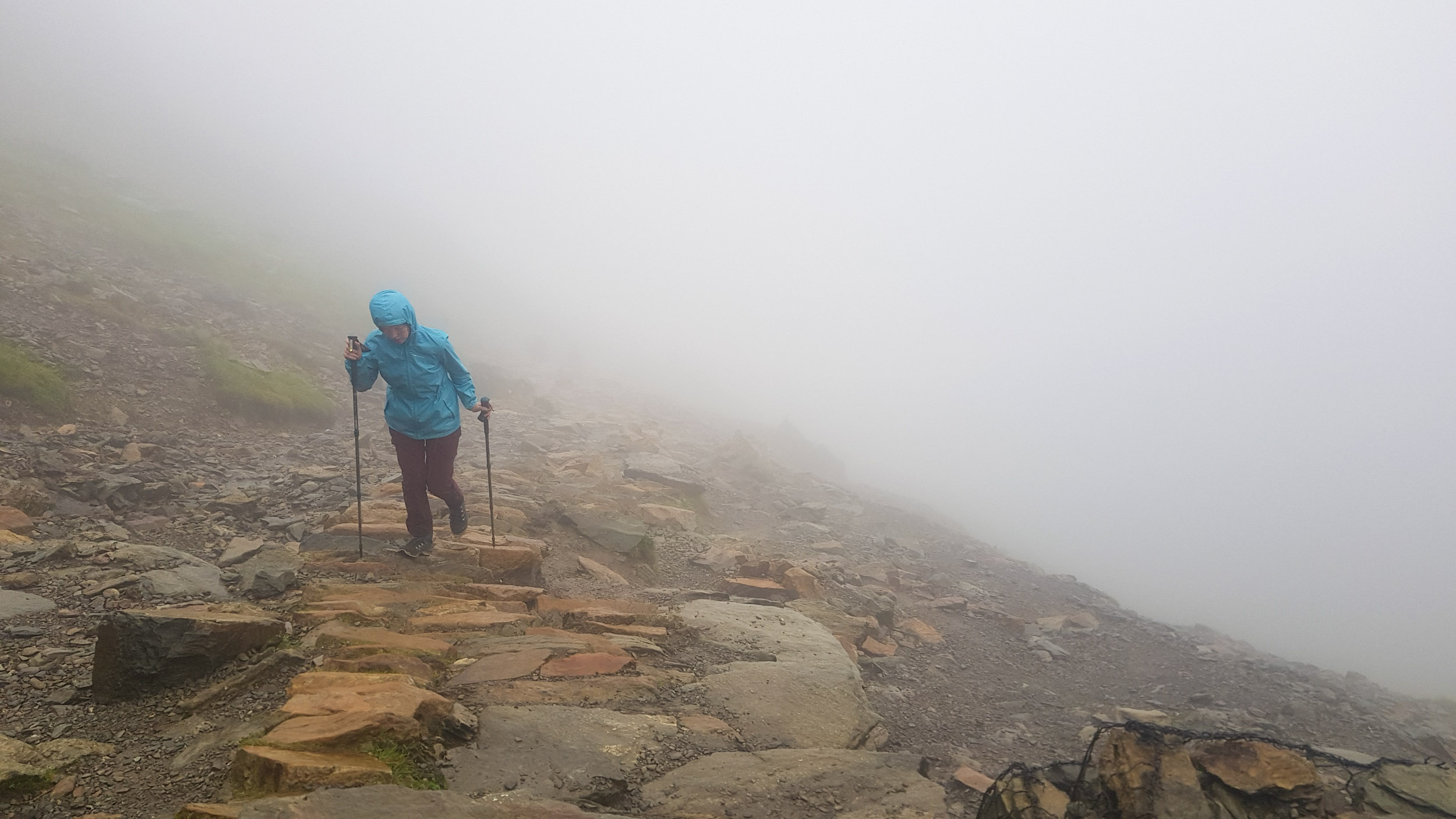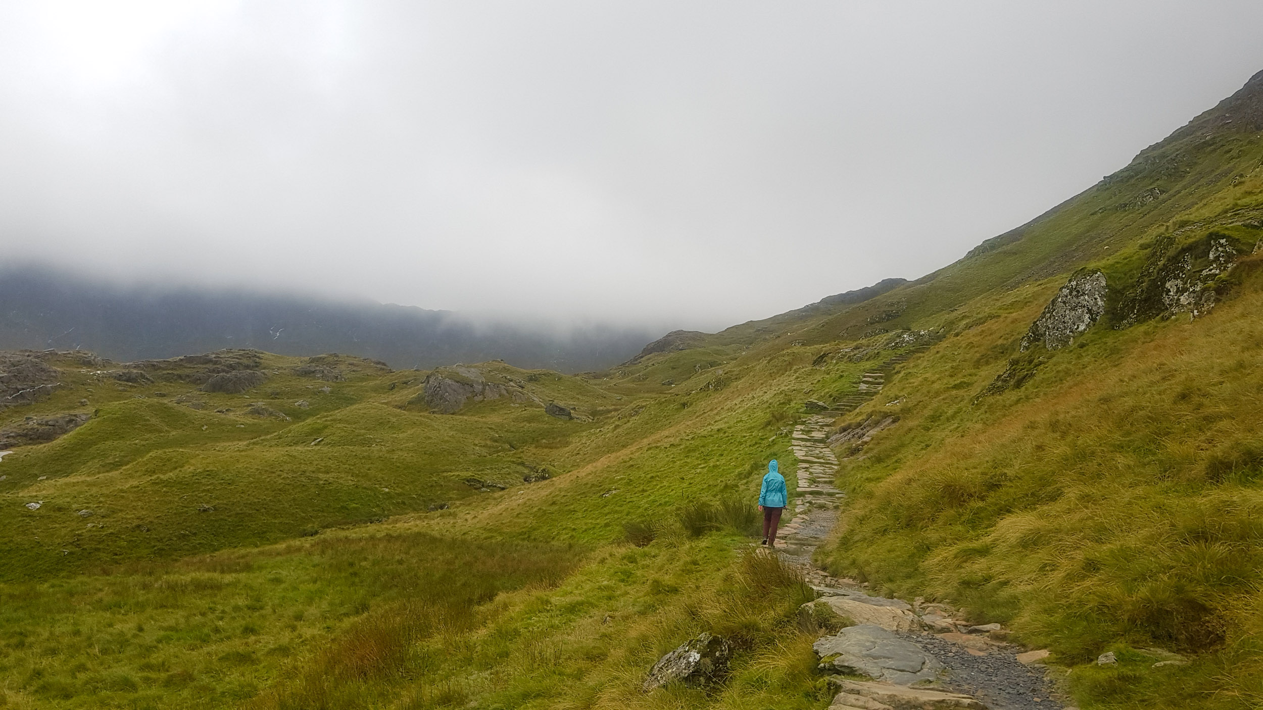 Het is het soort aanhoudende miezer en mist waardoor je binnen no-time doorweekt bent. Ik houd mijn ogen gericht op mijn voeten en plaats m’n stokken zo dat ik niet uitglijd over de natte stenen. Als ik dan toch even om me heen kijk, zie ik weinig. Enkel het pad omhoog en een handjevol mensen. Links en rechts houdt de wereld na enkele meters op. Ook is het bezoekerscentrum bij Pen-y-Pass (359 meter) niet meer zichtbaar, waar we zo’n 5 minuten geleden nog informatie inwonnen over het weerbeeld en de paden die we willen lopen. Pyg Track heen, Miners’ Track terug. De afgelopen dagen heeft het elke dag geregend in Eryri National Park en we hebben het weerbericht in de gaten gehouden met hoop op verbetering. Vandaag zou onze enige verantwoorde kans zijn om Snowdon op te gaan. De ‘thumbs up’ van de parkwachter en de voorspellingen van opklaringen zorgden ervoor dat we, ondanks regen, miezer en mist, begonnen aan de tocht naar boven.