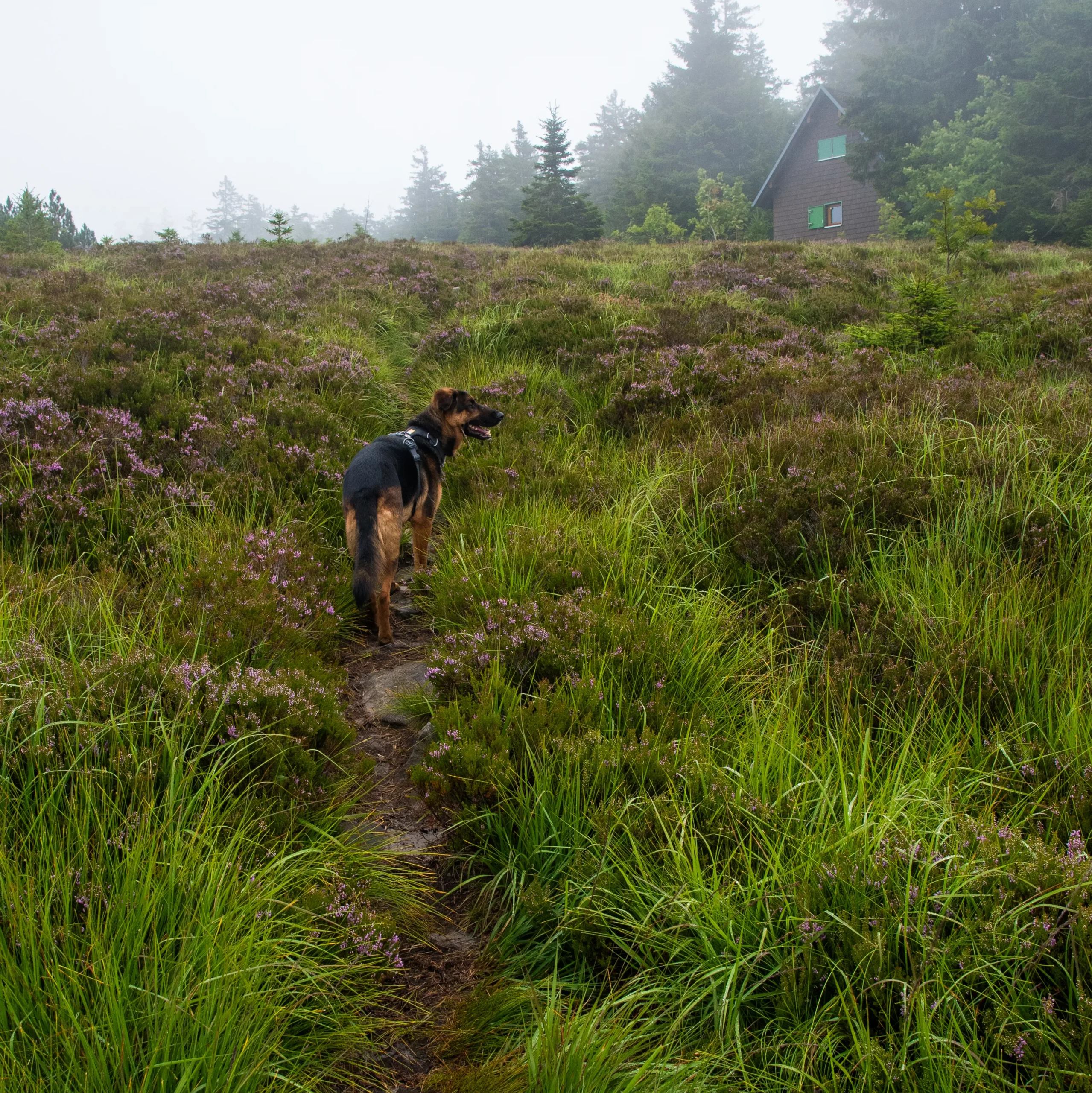 Wij liepen via de rechterkant van het meer door een poort die ons via grove stenen paden de berg op geleide, richting de Hornisgrinde (1164m), de hoogste berg van Noord-Schwarzwald. Het waren vooral grote stenen en door het regenachtige weer keek ik extra goed waar ik mijn voeten moest neerzetten. Met mijn 10+kg rugzak vol camera spullen, eten en drinken, dacht ik eventjes van waar ben ik aan begonnen. Maar, de mist tussen de bomen, de vogeltjes en de bijzondere sfeer tijdens deze hike door het Zwarte Woud maakte alles de moeite waard! Ook vond Hauru het geen enkel probleem met zijn 4 poten. We kwamen erg veel bordjes tegen met routes, dus verdwalen zat er vandaag niet in.