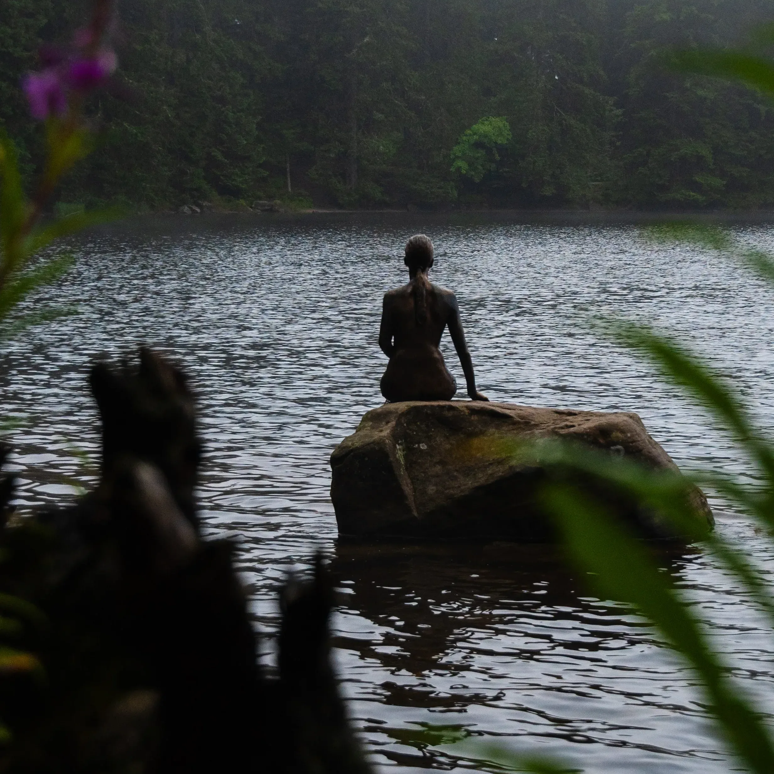 Wij konden via houten vlonders en een wandelpad om het water heenwandelen, en waren nog geen half uur onderweg tot wij tussen de mist, op een steen boven het water, een bronzen beeld van een zeemeermin zagen. Deze meermin kijkt over de Mummelsee heen en geeft een extra mysterieuze sfeer aan deze omgeving. Dit maakte de veels te vroege start van het wandelen rond de Mummelsee in ieder geval sprookjesachtig.